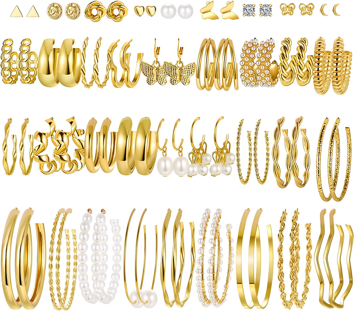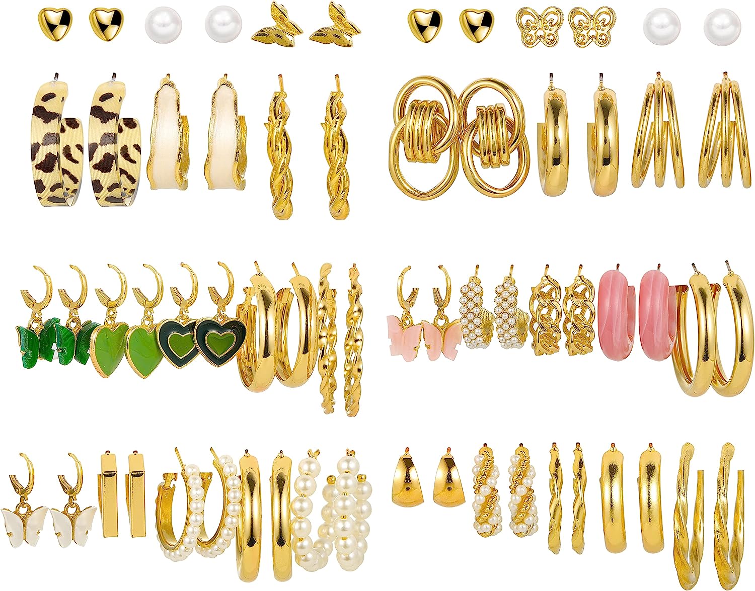32 Pairs Gold Hoop Earrings Set for Women Girls, Fashion Chain Link Hoop Stud Drop Dangle Earrings Boho Statement Hypoallergenic Earrings for Christmas Jewelry Gift(3052)