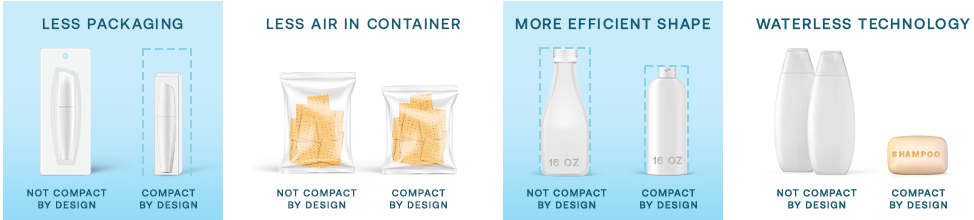 We created Compact by Design to identify products that, while they may not always look very different, have a more efficient design. With the removal of excess air and water, products require less packaging and become more efficient to ship. At scale, these small differences in product size and weight lead to significant carbon emission reductions.