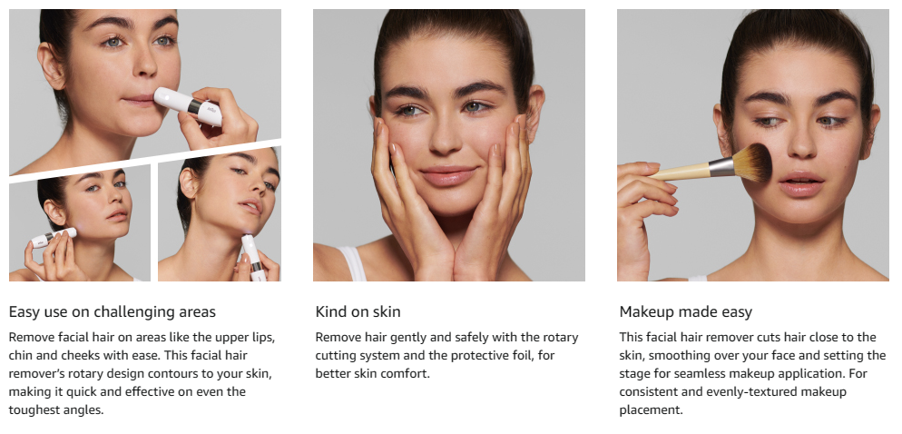 An elegantly designed, mini-sized electric facial hair remover for women, delivering fast and gentle hair removal results. The Braun Mini Hair Remover cuts hair close to skin level, leaving your face smooth, consistent and free of peach fuzz. Quick and gentle hair removal: whenever, wherever.Box includes: 1 X Mini Hair Remover1 X White Cap1 X Cleaning Brush1 X AA Battery