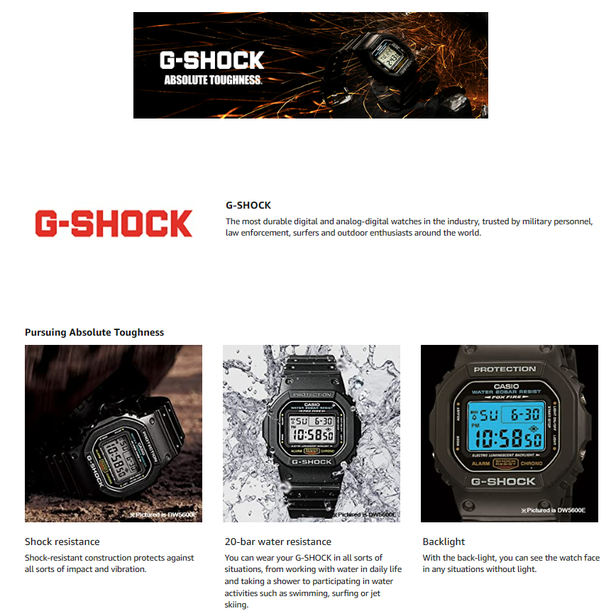 The simply designed Casio G-Shock Classic digital watch for men offers shock resistance that's great for your most vigorous sporting activities. The durable rectangular black watch case measures 45mm wide (1.77 inches), and it's matched to a comfortable black resin sports strap. It includes a stopwatch function that can measure events down to 1/100 of a second for the first 60 minutes (and down to 1 second from 60 minutes to 24 hours), and it offers elapsed and split time modes, and 1st-2nd place times. It also has a countdown timer with a 24-hour range. Other timekeeping features include a multi-function alarm, hourly time signal (which can be turned off), and 12/24-hour formats. This timepiece also features an Auto Calendar (pre-programmed until the year 2039), ±15-second accuracy per month, Afterglow backlighting, and water resistance to 200 meters (660 feet)--which will stand up to the rigors of recreational scuba diving.