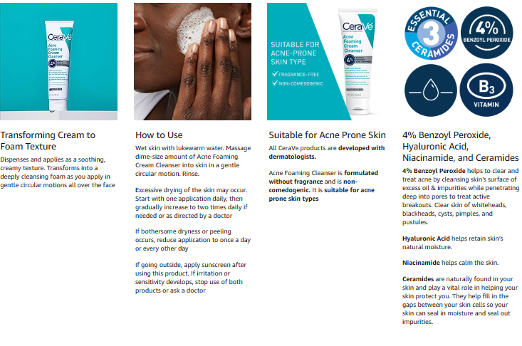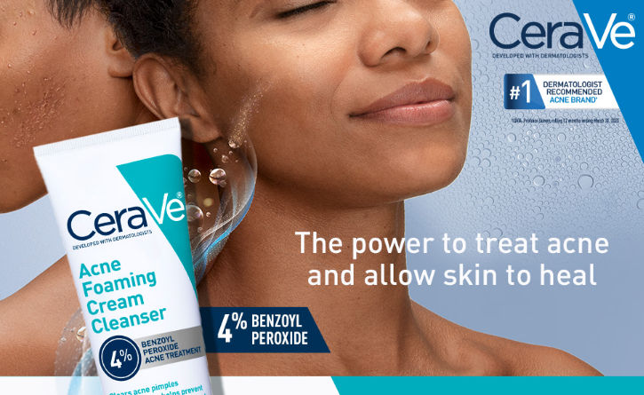 Developed with dermatologists, CeraVe Acne Foaming Cream Cleanser contains 4% Benzoyl Peroxide to help acne and prevent new flare-ups from forming. This daily acne face wash works to cleanse the skin, treat active breakouts, and maintain the skin's barrier. This unique formula has a transforming texture that dispenses as a cream and lathers into a rich foam.