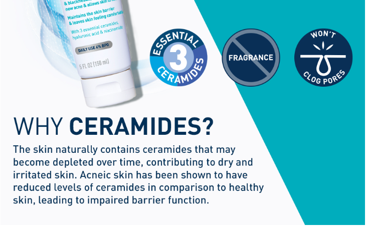 Key Ingredients:•4% Benzoyl Peroxide: Helps to clear and treat acne by cleansing skin’s surface of excess oil & impurities while penetrating deep into pores to treat active breakouts. Use daily to help clear skin of whiteheads, blackheads, cysts, pimples, and pustules.•Ceramides: Essential for healthy skin, ceramides help restore and maintain the skin’s natural barrier•Hyaluronic Acid: This ingredient attracts hydration to the skin’s surface and helps the skin retain moisture•Niacinamide: Helps calm the skin