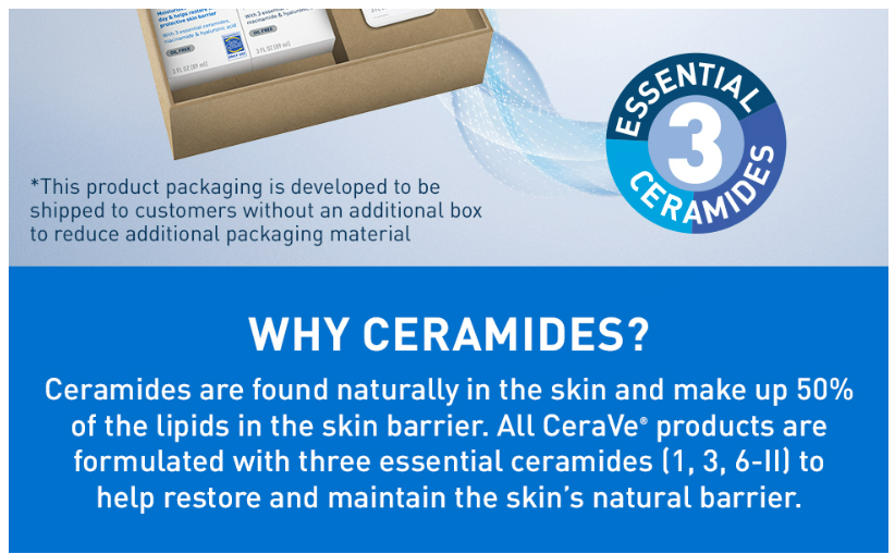 • [ 3 ESSENTIAL CERAMIDES ] Ceramides are found naturally in the skin and make up 50% of the lipids in the skin barrier. All CeraVe products, formulated with three essential ceramides (1, 3, 6-II)to help maintain the skin’s natural barrier.