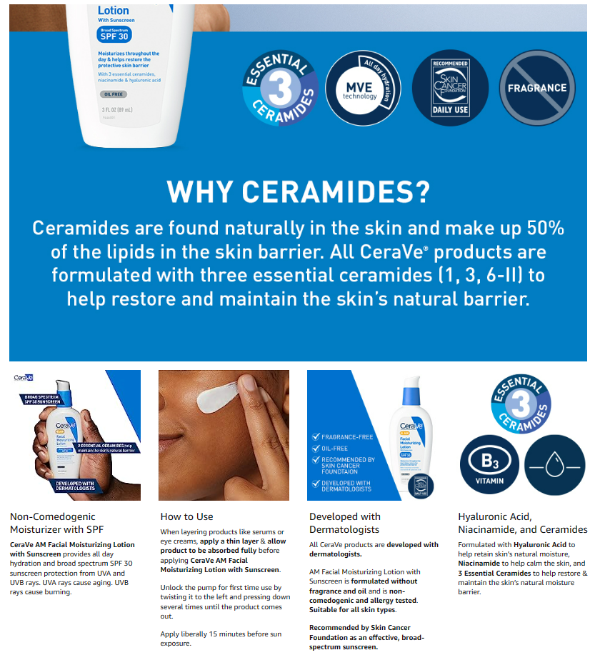 Developed with dermatologists, CeraVe AM Facial Moisturizing Lotion with Sunscreen moisturizes throughout the day and helps to restore the protective skin barrier. This sunscreen lotion is Formulated with broad spectrum SPF 30 sunscreen for daily UV protection, protecting your skin from damaging UVA and UVB rays. This non-comedogenic moisturizer with SPF 30 spreads easily without leaving a chalky residue.