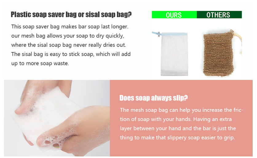Easy to Carry:Take the soap savers bag with you when you travel, or go on camping trips, so you won’t have to deal with the hassle of transporting wet soap. Make sure to rinse with clean water the soap and bag together after use, then hang them up.