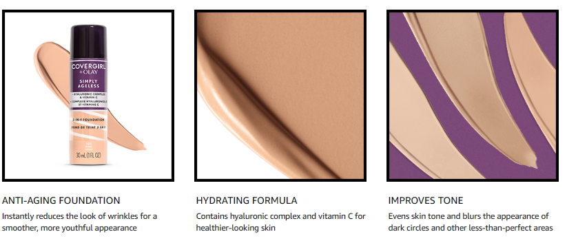 Give your skin that youthful glow with Covergirl & Olay Simply Ageless 3-in-1 Liquid Foundation. This anti-aging foundation plumps up skin to instantly reduce the appearance of wrinkles for a younger-looking complexion. Skin tone looks more even and other imperfections are blurred, while hyaluronic complex and vitamin C deliver firming hydration to keep your skin looking healthy and radiant. Pro-tip: Use with Covergirl Simply Ageless Anti-Aging Foundation Primer for maximum results.