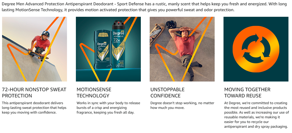 Freshen up, power up and move with confidence with Degree Men Advanced Protection Sport Defense Antiperspirant Deodorant. Supercharged with 72-hour odor protection, this antiperspirant deodorant for men works as hard as you do and provides superior motion-activated protection from sweat and odor. However you move, this antiperspirant deodorant delivers unstoppable freshness for that shower-clean feeling all day long. With a rustic, manly scent and nonstop odor and sweat protection, this Degree Men antiperspirant deodorant won't let you down – so you can stay fresh, for all the ways you move. Our MotionSense® technology doesn't stop working no matter how much you move. It works with unique microcapsules that sit on the surface of your skin. This powerful antiperspirant deodorant responds when you need it most, so that you can stay confident without having to worry about slowing down. Whether you're having a long day at work, playing sports, working out in the gym, or whatever the day throws at you, you can be confident you'll be protected from sweat and odor by this antiperspirant for men. This antiperspirant deodorant stick works as hard as you do, keeping you protected, so you can keep moving and stay active.