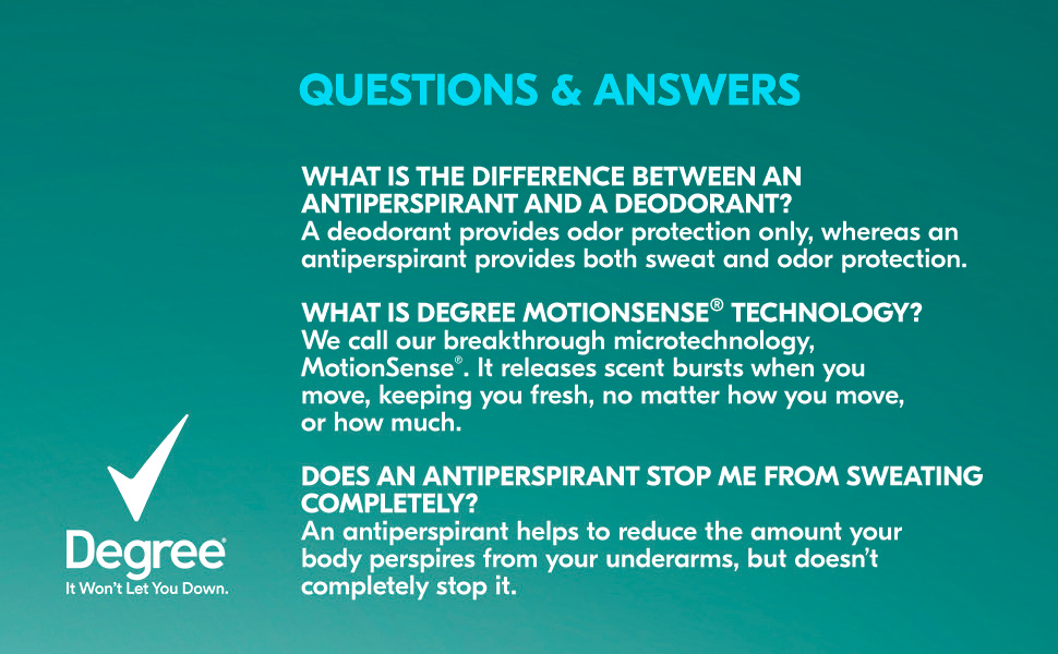 Degree Advanced Lavender and Waterlily Antiperspirant Deodorant lets you face the day with confidence. This antiperspirant for women features 72-hour sweat and odor protection and the relaxing, floral scent of lavender and waterlily. Only Degree has MotionSense technology that moves in sync with your body. This antiperspirant deodorant releases a burst of subtle fragrance every time you move, for nonstop protection. Degree Lavender and Waterlily deodorant for women keeps you feeling fresher, drier, and more confident. This powerful antiperspirant deodorant responds when you need it most, so you don't have to worry about slowing down. Simply swipe and start moving. This antiperspirant deodorant for women with a relaxing scent gives you the confidence to keep moving all day long. Degree Lavender and Waterlily Antiperspirant Deodorant keeps you feeling cool, fresh and protected from sweat and odor. Degree gives you the confidence to keep moving, however you move. Lavender and Waterlily also comes in an antiperspirant deodorant dry spray. At Degree, we’re doing everything we can to help keep the planet moving. That’s why we're increasing our use of reusable materials, making it easier for you to recycle our antiperspirant and dry spray packaging. Whatever you do, however you do it, Degree wants to help inspire the confidence in you to move more, and with this antiperspirant deodorant, it’ll provide you the confidence that sweat and odor will not get in your way of your progress. Degree. It won’t let you down.
