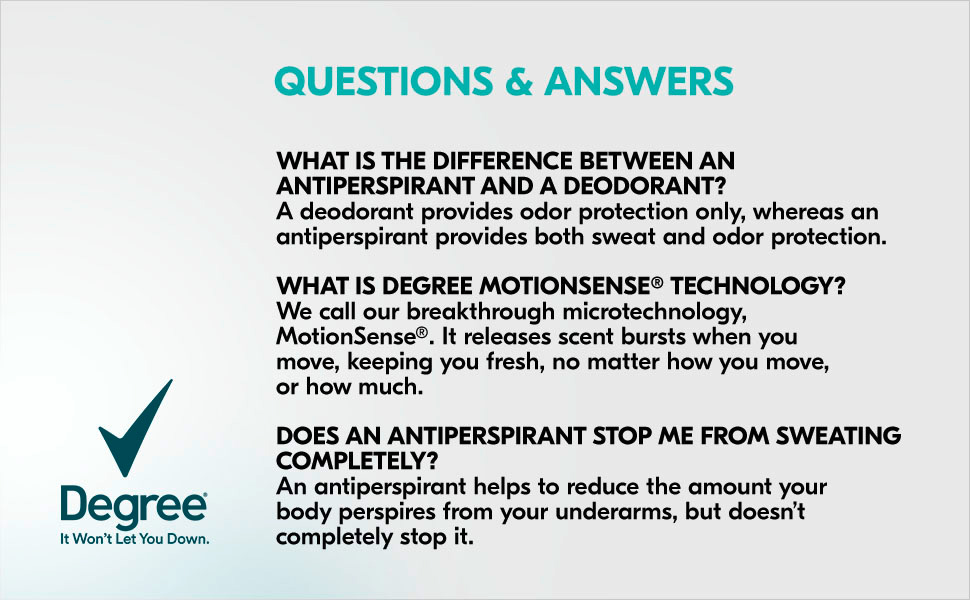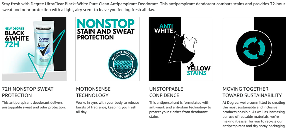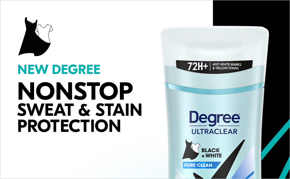 Degree is upgrading to our best formula yet. Our new and improved formulation gives you 72 hours of nonstop sweat and odor protection. You will still find all the same fragrances you know and love, but now with our new and improved long lasting protection! For a limited time, you may still receive our old 48-hour formulation while all our new 72-hour products make their way to a store near you. For the details of these changes, scroll down to see a full list of ingredients. Degree UltraClear Black+White antiperspirant deodorant in Pure Clean comes in a 2.6 oz deodorant. This will be your new favorite go to women's deodorant for everyday use. With no white marks on black clothes and no yellow stains on white clothes, you'll look great and feel confident that you're protected from deodorant stains, sweat and body odor. Degree antiperspirant deodorant UltraClear Black+White has a breakthrough formula that cuts down on the stains that some other antiperspirants leave behind when they mix sweat and natural oils produced by your body. With a Pure Clean fragrance, expect a fresh and airy fragrance with a clean feel.