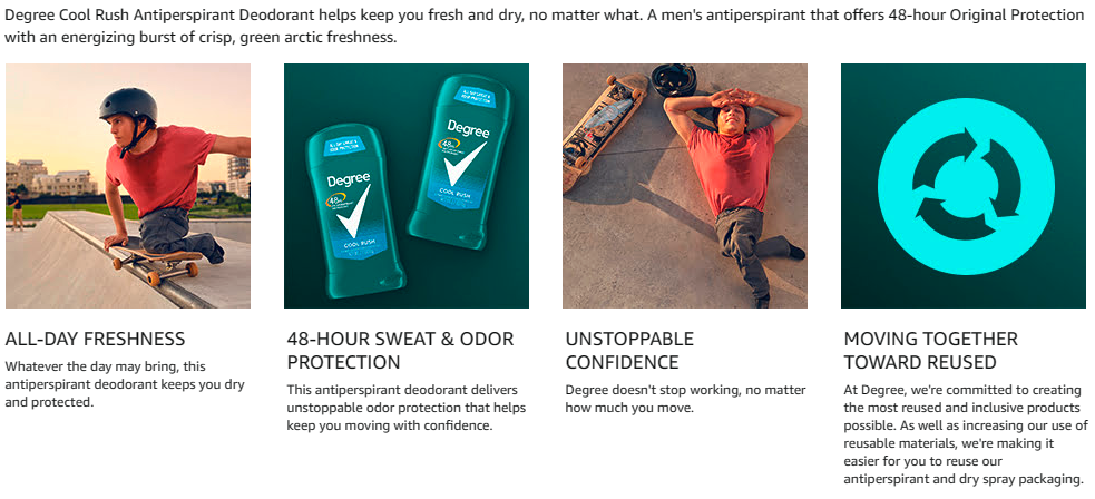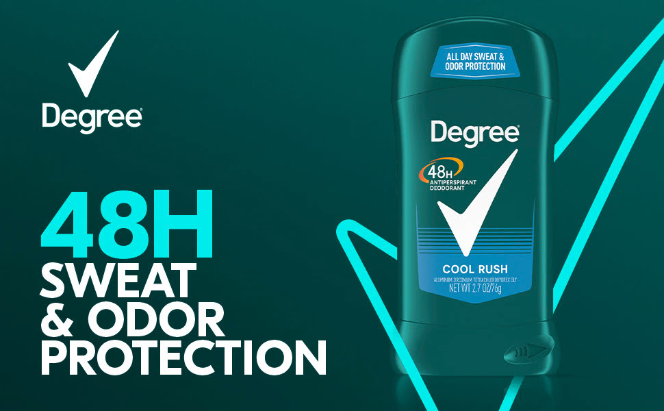 Degree Cool Rush helps keep you fresh and dry, no matter what. This mens antiperspirant has 48H non-stop protection, non-stop confidence with a scent that combines an energizing burst of crisp, arctic freshness in Cool Rush men’s fragrance and. Whether you’re having a long day in the office, playing sports outdoors or working out in the gym, you can be confident that with this mens deodorant you’ll be protected from underarm sweat and body odor. It comes in an easy-to-use applicator stick - you simply turn the dial to raise the stick, apply a thin layer to your underarms, and you’re ready for anything. Every time you move, Degree men antiperspirant deodorant keeps you fresh and free from strong body odor and underarm sweat. This powerful antiperspirant deodorant responds when you need it most. Whatever you do, however you do it, Degree wants to help inspire the confidence in you to move more, and with this deodorant for men, it’ll provide you the confidence that sweat and odor will not get in your way of your progress. Degree. It won’t let you down.