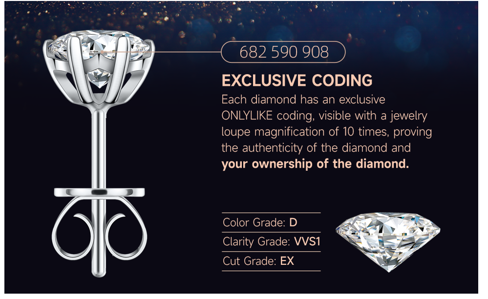 The certificate of quality, issued by the GRA, an authoritative appraisal agency, truly determines the diamond's grading standards. Each diamond has an exclusive ONLYLIKE coding, visible with a jewelry loupe magnification of 10 times, proving the authenticity of the diamond and your ownership of the diamond. ( Except 0.3 carat, The 0.3 carat size is too small to be engraved with an exclusive coding ).