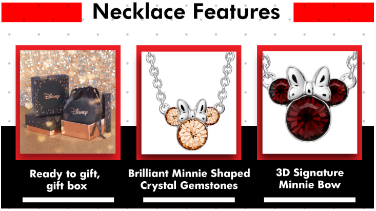 Fabulous and Famous Silhouette: The exquisitely crafted pendant in the form of Minnie’s head, topped by her signature bow, sparkles with a trio of unique crystals that represent your birth month or favorite color