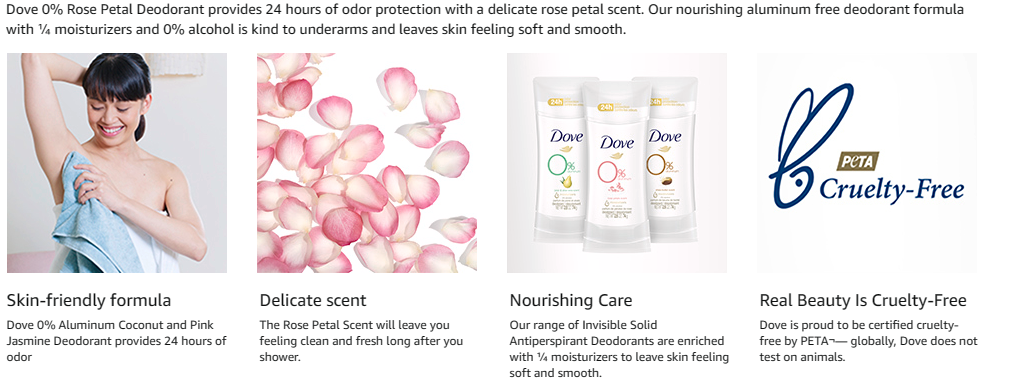 If self-care had a fragrance, what would it be? Our vote goes to delicate, floral scents. With Dove Advanced Care Rose Petals Antiperspirant Deodorant Stick, you can treat your skin and your senses, whenever you need it most. Enjoy the light, flowery scent of rose layered over sandalwood and velvety peach. Wondering how to care for underarm skin? This antiperspirant stick, which is enriched with our signature 1/4 moisturizers with natural oil, gives you noticeably soft skin. With a kind-to-skin formula that contains 0% alcohol (ethanol), it's a great antiperspirant deodorant for irritated underarms. And that's not all. This gentle, non-irritating deodorant stick keeps you protected from sweat and odor for up to 48 hours. Use Dove deodorant for women regularly and you can enjoy beautifully soft and comfortable underarms that stay dry all day long. For best results, apply this Dove antiperspirant deodorant to dry skin after showering and enjoy fresh, comfortably dry skin from morning to night. Dove is certified cruelty-free by PETA because we believe that real beauty is cruelty-free. We're on a mission to help women raise their self-esteem - because we believe beauty should be a source of confidence, not anxiety. Dove Antiperspirant Deodorants deliver effective underarm protection and are kind to skin, so women can be free of underarm inhibitions and live beautifully unselfconsciously.