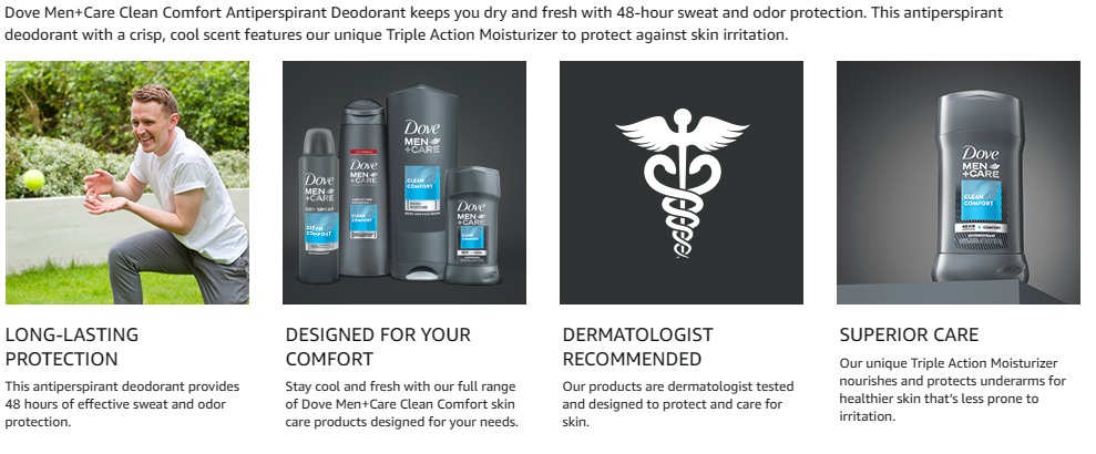 Looking for an antiperspirant for men that’s designed to keep you feeling fresh and confident? Try Dove Men+Care Clean Comfort Antiperspirant Deodorant Stick. Our Clean Comfort antiperspirant deodorant provides powerful 72-hour protection against sweat and odor while caring for your skin. This antiperspirant for men is formulated with 1/4 Moisturizing Cream to deliver skin moisturization and help protect against skin irritation. Discover Dove Men+Care Clean Comfort Antiperspirant Deodorant’s long lasting subtle fragrance to refresh your senses and leave you feeling fresh all day. Simply apply Dove Men+Care Clean Comfort Antiperspirant Deodorant in an even layer onto each of your underarms for best results. You now have the powerful protection you need to stay fresh and feel confident all day. Dove care goes further than moisturizing protection with PETA Cruelty-Free certification and recyclable plastic packs. Looking for more Dove Men+Care skin care products? Try the full range of Dove Men+Care products, including deodorants, antiperspirants, dry spray antiperspirant deodorants, body washes, face and body bars, and hair care products.