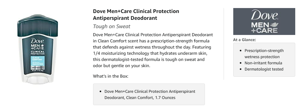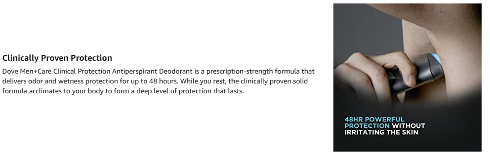 Are you looking for prescription-strength protection from sweat? Try Dove Men+Care Clean Comfort Clinical Protection Antiperspirant for a clinical strength Antiperspirant for men that will give you all day powerful protection. It delivers long-lasting protection against odor and wetness and, as part of the Dove Men+Care Antiperspirants & Deodorants range, it’s specifically designed to care for men’s skin. Its unique formula, with Dove’s ¼ moisturizer technology, gives you all the strength and care of a Dove Men+Care Antiperspirant. This clinical strength Antiperspirant for men helps to combat sweat and odor, and its subtle scent will leave you feeling fresh all day long. Swipe this Dove Men+Care Antiperspirant up and down on each armpit several times to dispense an even layer across your skin. Use it in the morning or, for maximum protection, apply at night before going to bed. The clinically-tested soft solid formula works overnight to form a deep level of protection that lasts throughout the next day. It’s tough on sweat, not on skin. The next time you need prescription-strength protection against sweat without compromise, reach for Dove Men+Care Clean Comfort Clinical Protection Antiperspirant: a clinical strength Antiperspirant for men.