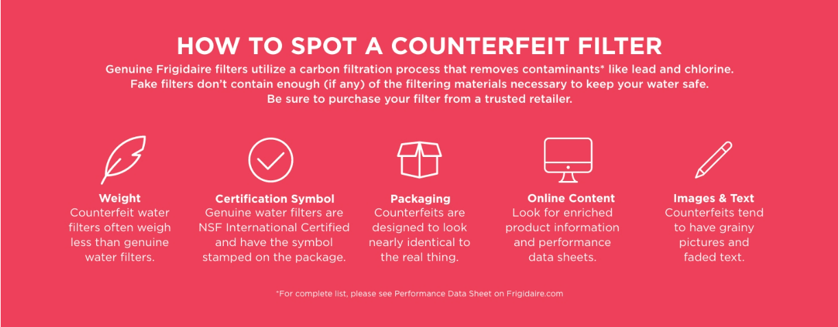 Keep safe, great tasting water flowing with PureSource Ultra II water filters — EPTWFU01 reduces up to 99% of contaminants, cuts back on plastic and saves the cost of bottled water. NSF and WQA certified. Look for our berry-colored design with our new Genuine Filters seal on the package to know for certain your filter is authentic and sold by Frigidaire. Frigidaire Genuine Filters – the smarter, safer choice. Fits the following Fridge Model numbers, press ctrl+F to find quickly: 20462151, 90462157, CFEH272ITD, CFEH272ITS, CFEH272ITW, DGHD2361TF, DGHK2355TF, DGHX2655TF, FRFG1723AV, FFHB2750TD, FFHB2750TE, FFHB2750TP, FFHB2750TS, FFHD2250TD, FFHD2250TS, FFHG2250TD, FFHG2250TS, FFHN2750TD, FFHN2750TS, FFSC2323TS, FG4H2272UD, FG4H2272UF, FGHB2868TD, FGHB2868TE, FGHB2868TF, FGHB2868TP, FGHD2368TD, FGHD2368TF, FGHG2368TF, FGHN2868TE, FGHN2868TF, FGHN2868TP, FGSC2335TD, FGSC2335TF, FGSS2635TD, FGSS2635TE, FGSS2635TF, FGSS2635TP, FPBC2277RF, FPBC2278UF, FPBG2277RF, FPBG2278UF, FPBS2777RF, FPBS2778UF, FPSC2277RF, FPSC2278UF, FPSS2677RF, GRQC2255AF, LFHB2751TF, LFHD2251TF, LFHG2251TF, LFSC2324VF, LGHB2869TD, LGHB2869TF, LGHD2369TD, LGHD2369TF, LGHK2336TD, LGHK2336TF, LGHX2636TD, LGHX2636TE, LGHX2636TF, LGHX2636TP, PRMC2285AF