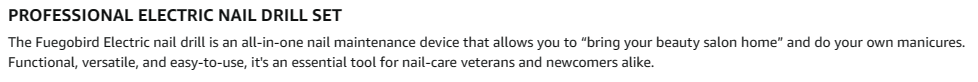 Multifunctional & Portable Nail Drill Kit: Experience versatile nail care with this powerful electric nail drill kit. With Fuegobird electric nail drill, you can shape, buff, grind, polish, and remove acrylic, poly gel, artificial, thick, builder gel, dip powder, fake, and natural nails, as well as dead cuticles with ease. Suitable for manicure and pedicure beginners and pros.