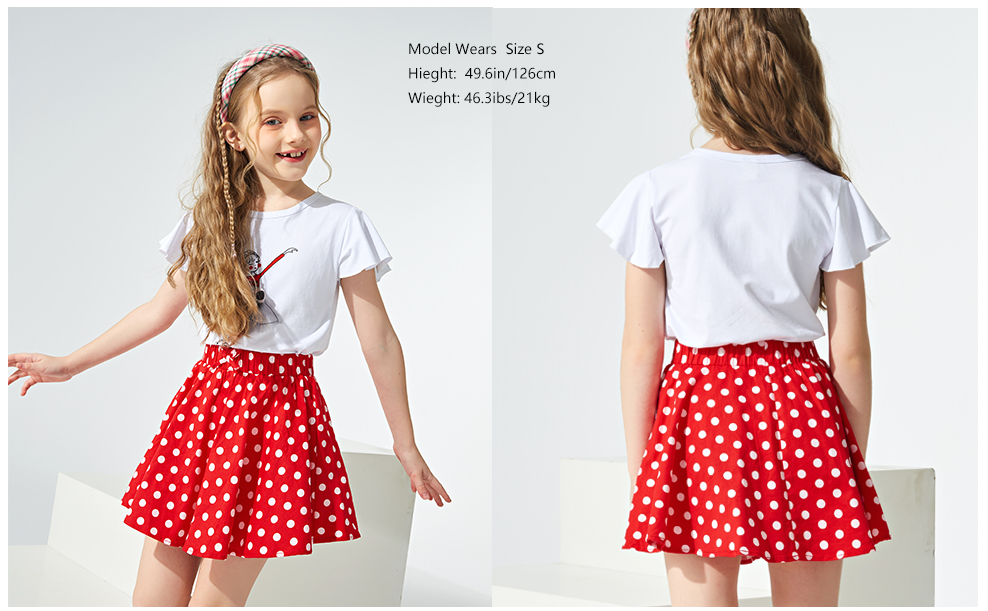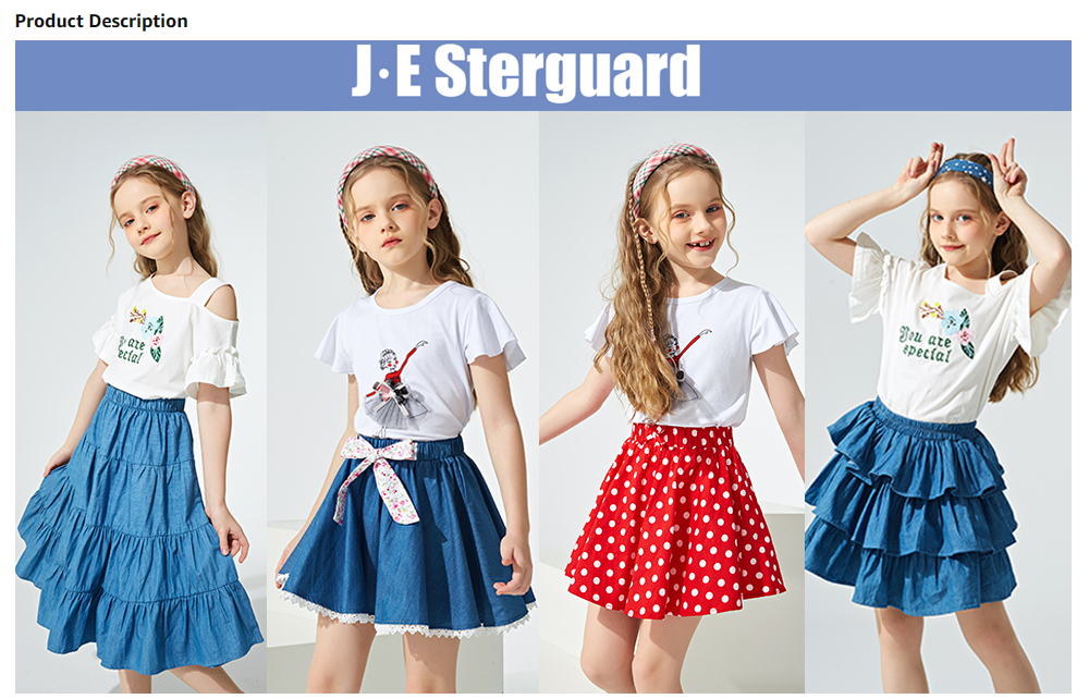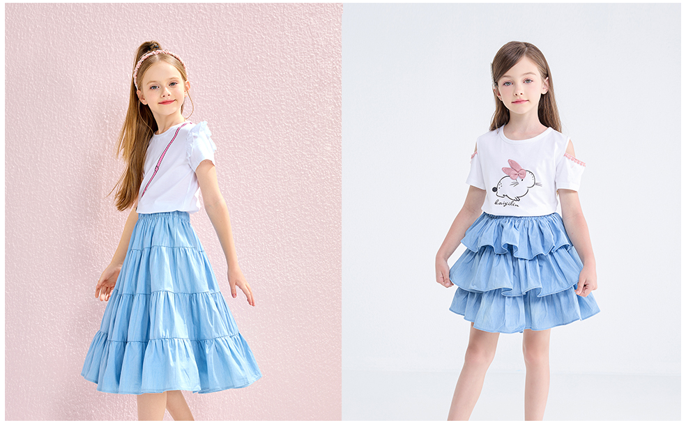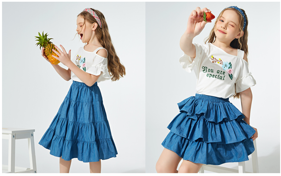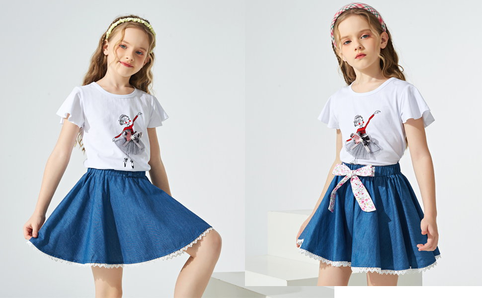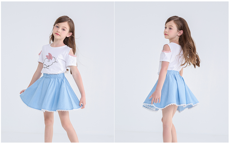 Girls Skater Skirt Denim Solid Color Denim Skirt with Lace Hem(5565)