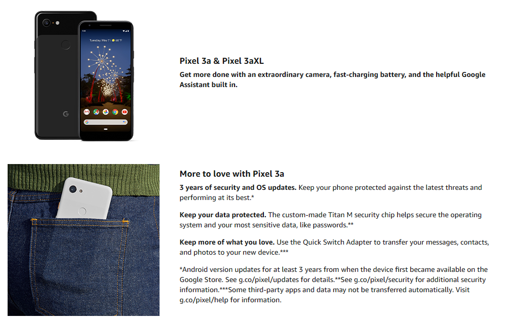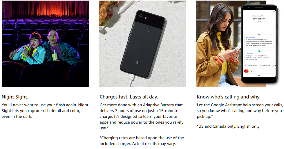 Get more done with Pixel 3A. It has an extraordinary camera with features like night sight, portrait mode, and HDR+. A battery that charges fast and lasts all day [7]. All the helpfulness of the Google assistant built in. And 3 years of security and OS updates included [8]. It’s everything you love about Google – in a phone. Works with all major carriers. 1 Google photos offer free unlimited online storage for all photos and videos uploaded in high-quality. Photos and videos uploaded in high-quality may be compressed or resized. Requires Google account. Data rates may apply. 2 US and Canada only. English only. 3 approximate battery life based on a mix of talk, data, standby, mobile Hotspot and use of other features, with always on display off. An Active display or data usage will decrease battery life. Charging rates are based upon use of the included charger. Charging time performance Statistics are approximate. Actual results may vary. 4 Android version updates for at least 3 years from when the device first became available on the Google store. 5 some third-party apps and data may not be transferred automatically. 6 approximate battery life based on a mix of talk, data, standby, mobile Hotspot and use of other features, with always on display off. An Active display or data usage will decrease battery life. Charging rates are based upon use of the included charger. Charging time performance Statistics are approximate. Actual results may vary 7 Android version updates for at least 3 years from when the device first became available on the Google store.