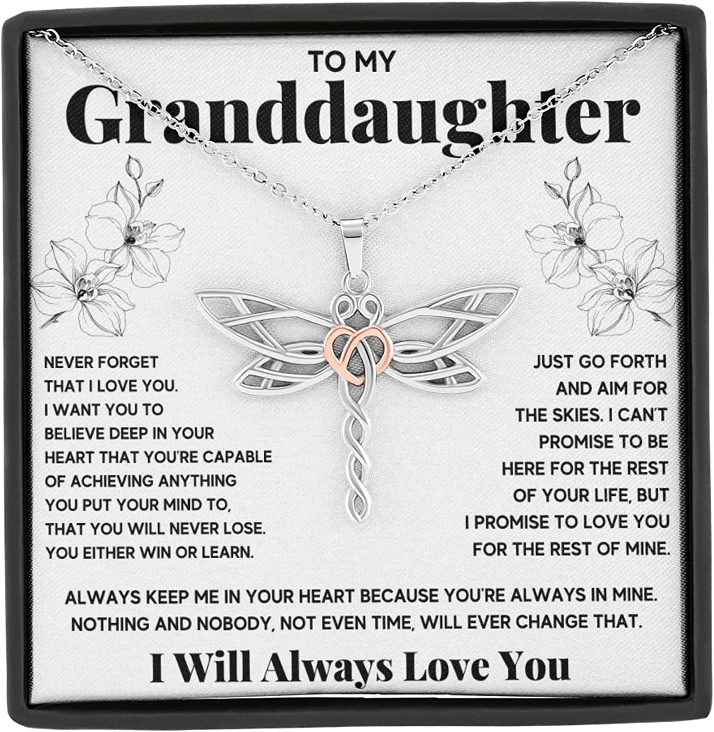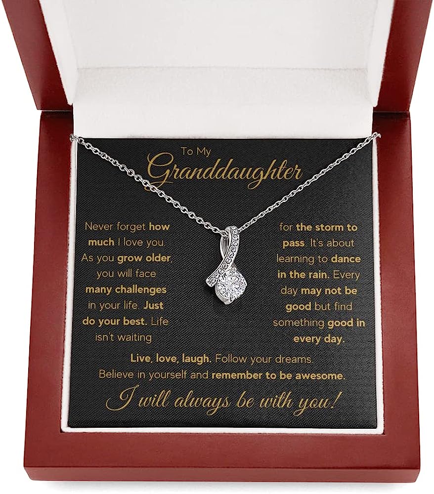 Message Reads: To My Beautiful Granddaughter, Someday when the pages of my life end, I know that you will be one of its most beautiful chapters. always keep me in your heart, for you are always in mine. Nothing and nobody, not even time, will ever change that. Love, GrandPa. Two hearts embellished with Cubic Zirconia stones interlocked together as a symbol of never-ending love. Made with high quality polished surgical steel. The cable chain measures 18 inches with a 4-inch extension and fastens with a lobster clasp. Pendant dimensions: -Height 0.6" (1.5cm) -Width 1.1" (2.7cm)