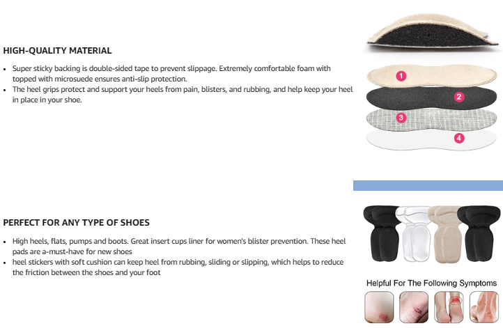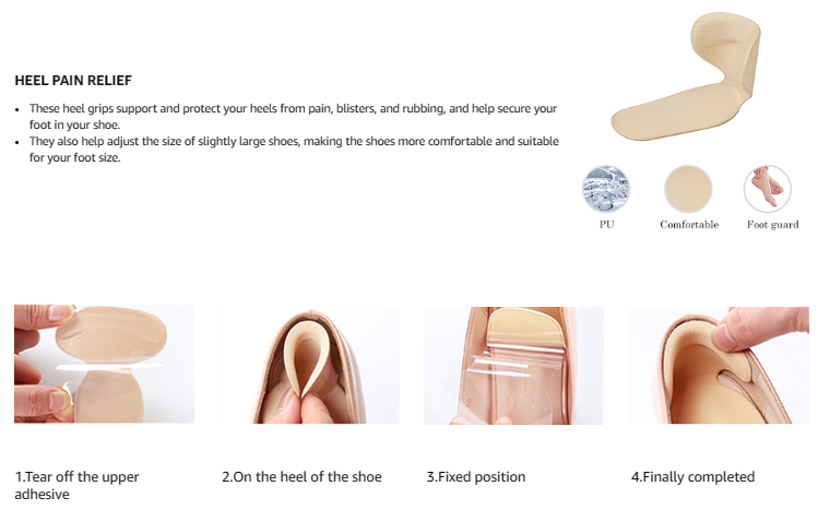 Sticky Design:Heel Pads have strong sticky backing that keeps them in place firmly. You can remove the adhesive backing and place the pads in the inside heel of shoes. Fixed for a while.