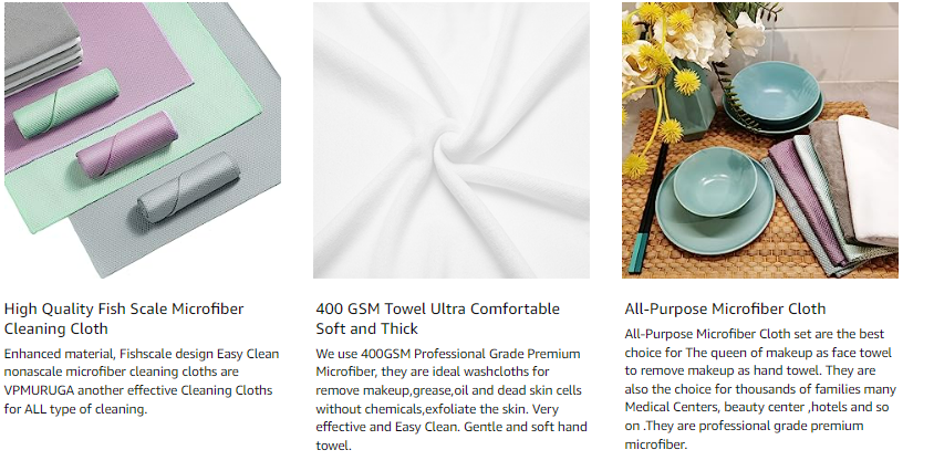 We use 400GSM Professional Grade Premium Microfiber. They are ultra Comfortable Soft Gentle and Thick.They are ideal washcloths for remove makeup,grease,oil and dead skin cells without chemicals,exfoliate the skin. Very effective and Easy Clean.