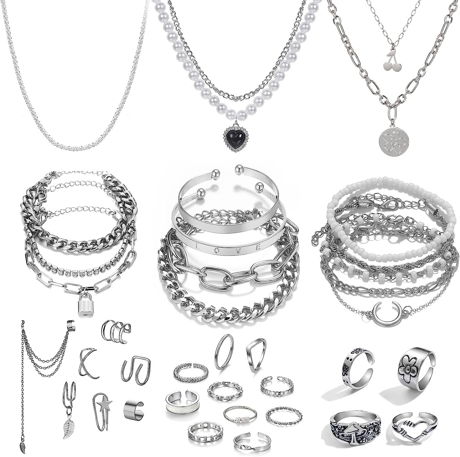 IFKM 36 PCS Silver Plated Jewelry Set with 3 PCS Necklace, 12 PCS Bracelet, 7 PCS Ear Cuffs Earring, 14 Pcs Knuckle Rings for Women Girls Valentine Anniversary Birthday Friendship Gift(3116)