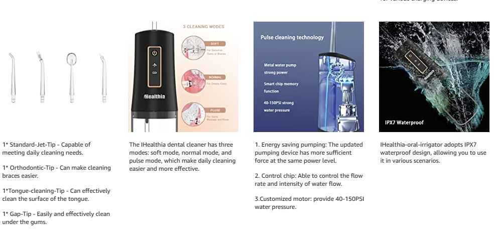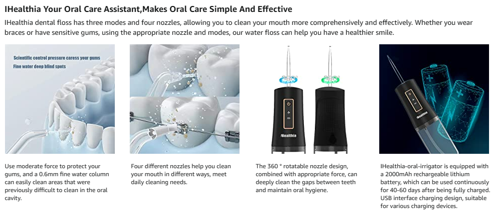 【Best Water-flossers for Teeth】IHealthia Water-Flosser has three modes, four 360 ° rotating nozzles, which can further clean your teeth and braces, making your smile more confident.