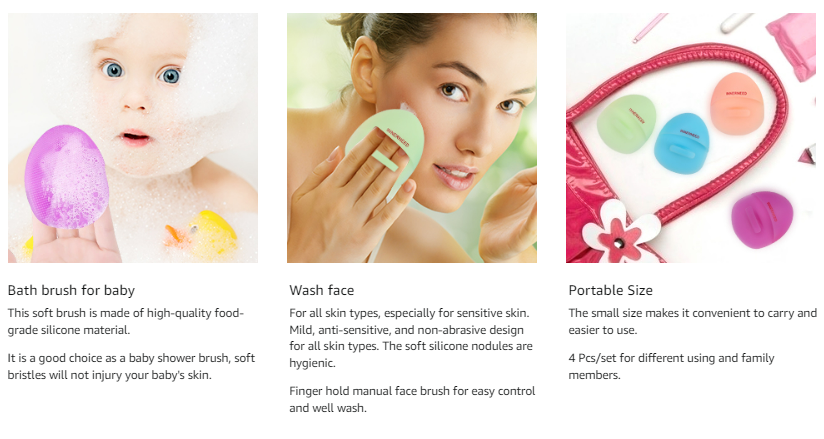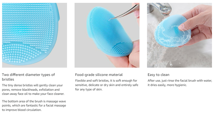Brush side: thick and soft bristles with massage wave points area will help gently clean your pores, remove blackheads and clean away your facial oils, to make your face cleaner. Front side: finger handle design for one-hand operation. Easy to hold, and no need to worry about the slip.