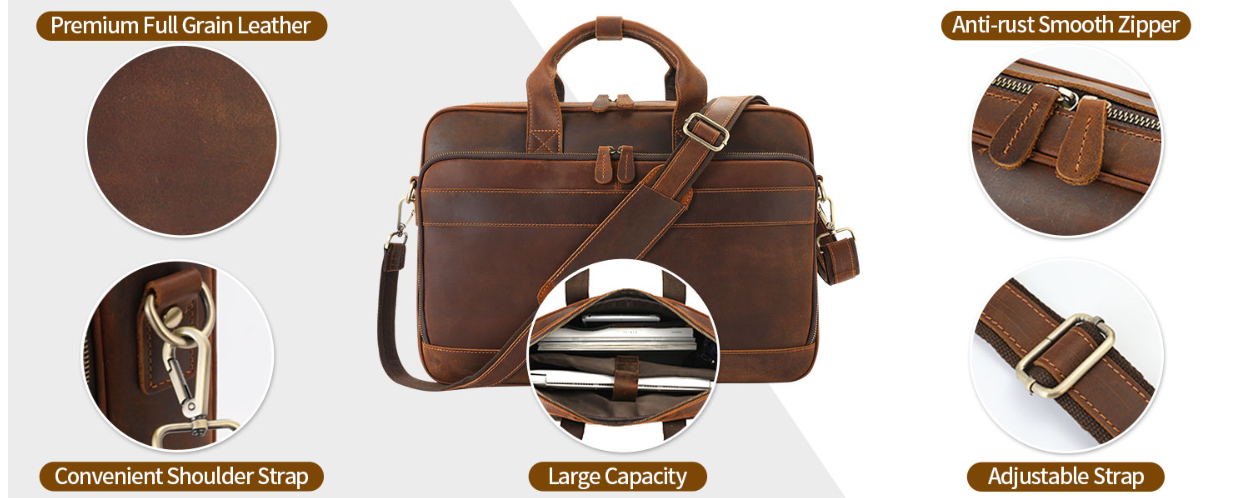 Material: 100%Cowhide Grain leather mens briefcase. Sturdy top handle men's briefcase, adjustable nice shoulder straps (appr. 85 ~ 140 cm).