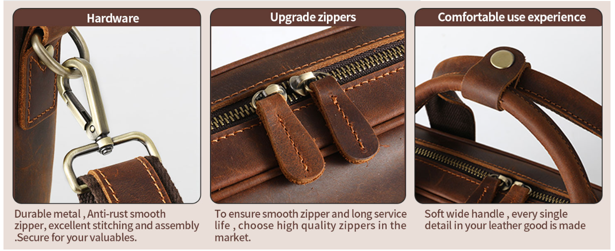 Anti-dirty leather laptop bag , light weight,also can holds A4 documents, 15.6 inch laptop, books,conference files,checkbook, pens,wallet,phone and other essentials etc. Well proportioned design leather computer bag for business workplace,business trip, and daily work men bag.