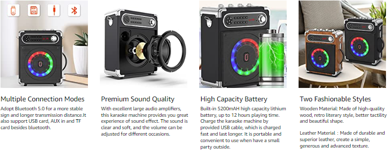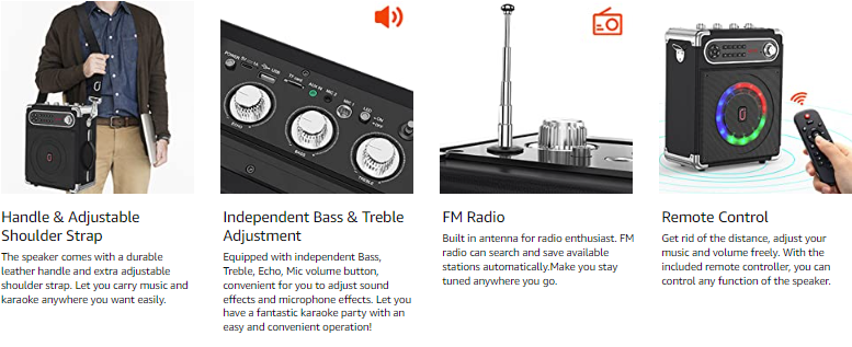 The product has a built in Bluetooth 5.0 provide the more stable transmission and longer distance, Works with all of your favorite devices like iPhone, Android mobile phone, iPad, Tablet, PC, no cables needed , Great for churches, small parties, schools, class rooms, gyms, corporate meetings & presentaions