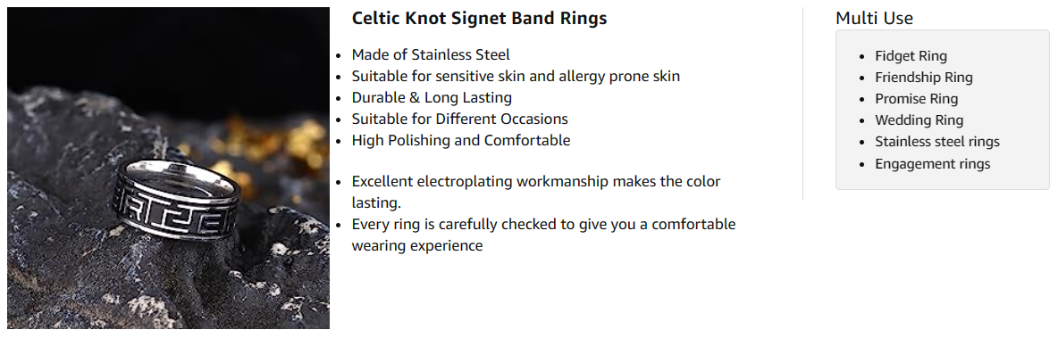 • 【Standard Ring Size】Width:Celtic Signet Ring is 0.57”, Thumb Wide Ring is 0.67”, Cuban Chain Spinner Ring is 0.3”,Greek Key Engraved Ring is 0.3''.Size 7-13 for Available,Suitable for Most Unisex Finger.Before Choose the Ring Size Please Measure Your Finger in Right Way to Save Your Time.You Can Refer to the Last Size Reference Chart to Choose the Ring Size.