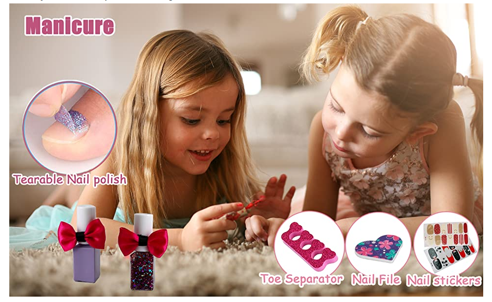 - Kids manicure set includes 2 nail polishes, 2 nail stickers, 1 nail file, 1 toe separator.