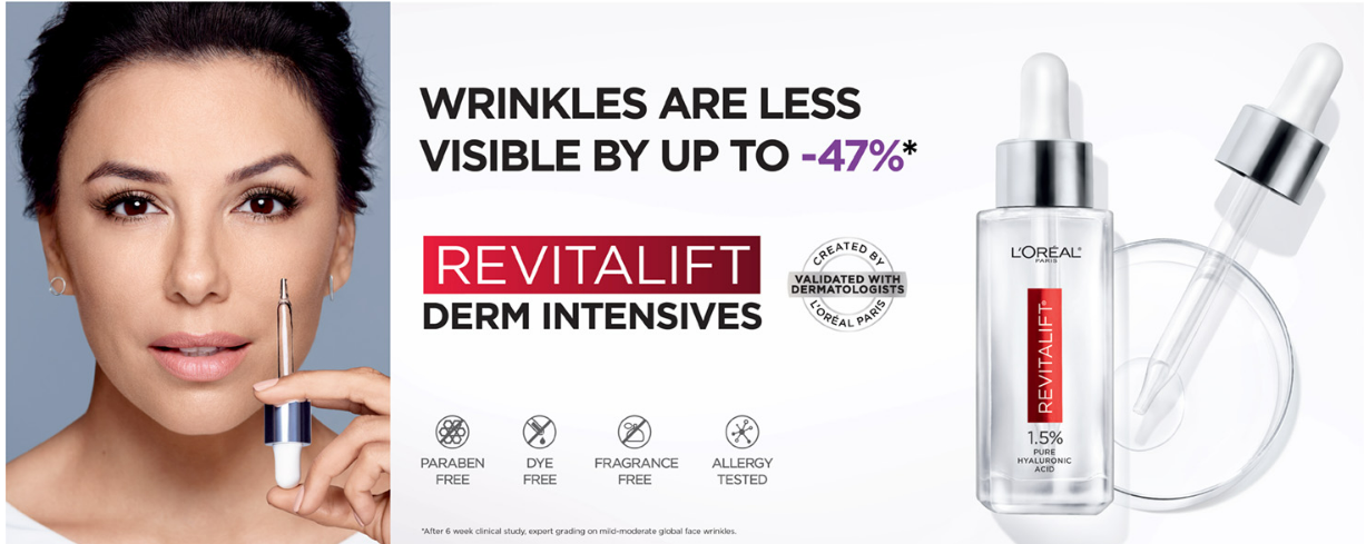 Revitalift Derm Intensives 1.5% Pure Hyaluronic Acid Serum with Vitamin C is a derm-validated, anti-aging serum to intensely hydrate, replump, reduce wrinkles and moisturize for dewy-looking skin.