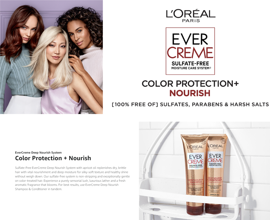 L’Oral Paris EverCreme Deep Nourish Shampoo is a lightweight sulfate free shampoo that moisturizes and nourishes dry hair for silky-soft texture and healthy shine without weigh down. Our shampoo for dry hair is especially gentle on color treated hair. Hydrating Apricot oil deeply conditions and smooths, leaving hair looking healthier after the 1st use. Our formulas are especially gentle on color treated hair.There are no harsh sulfates, salts or surfactants that can strip, dull and damage hair. Experience a purely sensorial lush, luxurious lather and a fresh aromatic fragrance that blooms. • Infuses Essential Nourishment to Revive Hair • Sulfate Free • No Heavy Waxes • No Weigh Down Apply to wet hair and massage gently into a thick lather. Rinse thoroughly. Follow with EverCreme Deep Nourish conditioner. Use with EverStrong Break Proof Lotion.