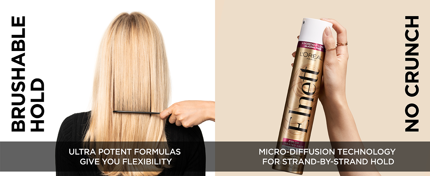 New Look- L'Oreal Paris Elnett Satin Hairspray for Color-Treated Hair with a new look but the same long-lasting brushable hold leaving hair feeling clean with a soft, shiny finish and a satin touch