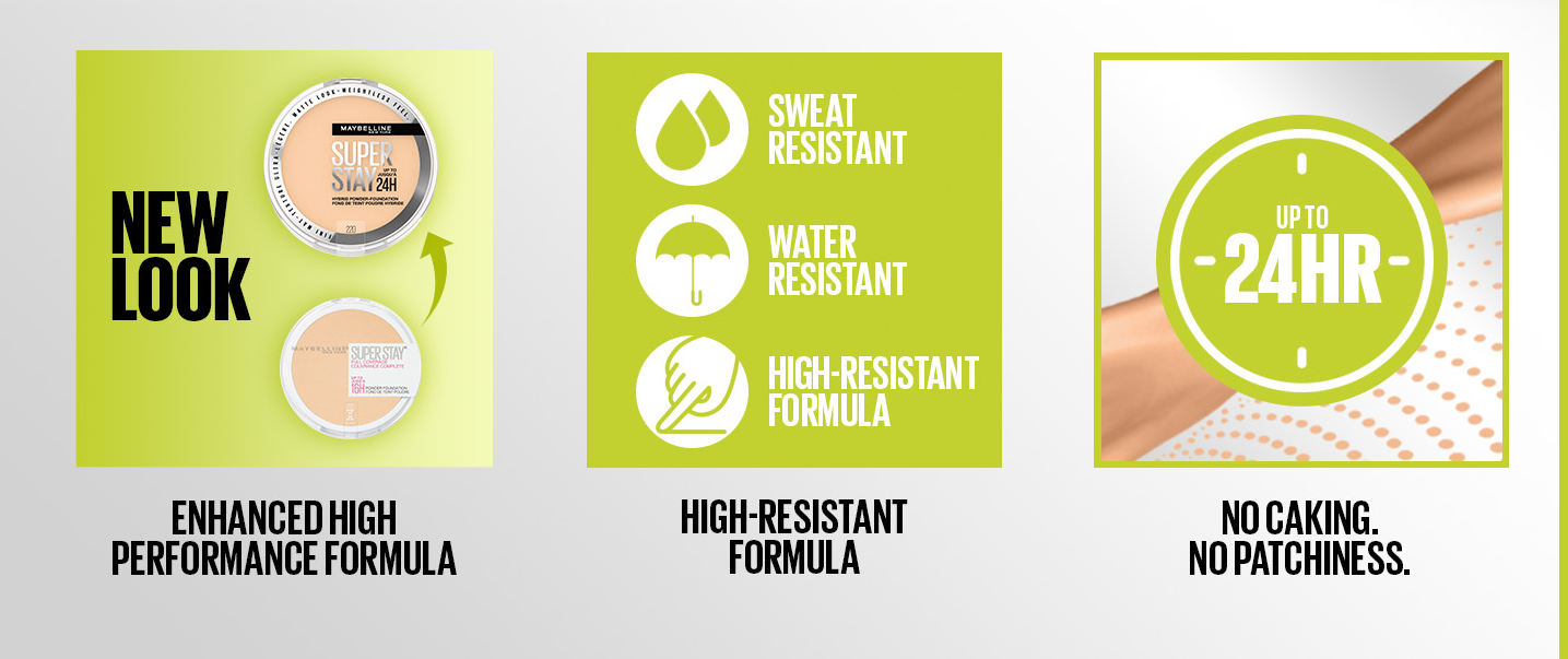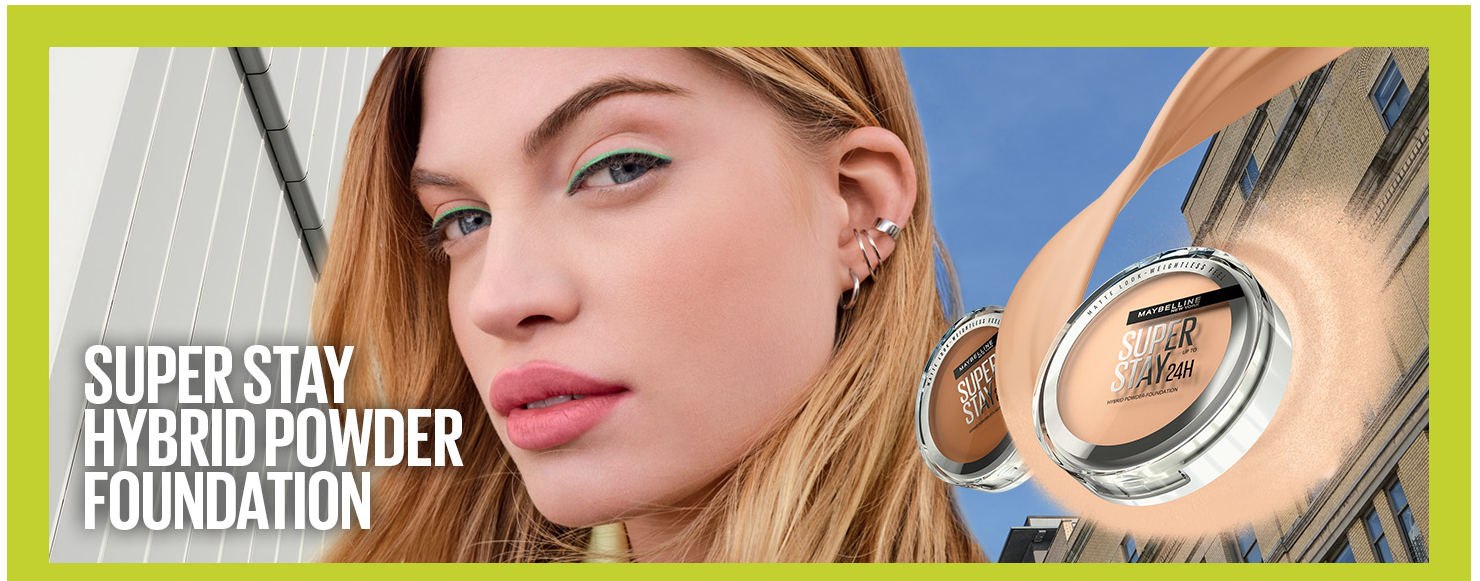 Get your soft-matte look with Maybelline New York’s SuperStay up to 24H Hybrid Powder-Foundation. This medium-to-full coverage superhero hybrid delivers up to 24 hours of super staying power. Fueled by Super resistant hybrid technology, its formula unites the best of both worlds: the performance of a liquid with the comfort of a powder. Super lightweight, super comfortable feel. Longwear that is sweat-resistant, water-resistant, and transfer-resistant. Resists caking and patchiness. Just swipe it on and you’re ready to take on the city!