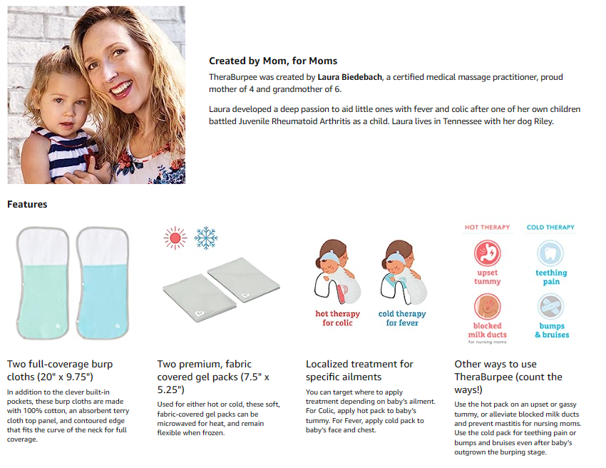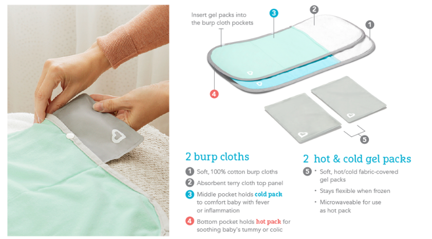 Localize placement of the gel packs depending on the baby’s ailment. Looking for a little extra soothing? Try the aromatherapy version, TheraBurpee with Essential Oils! Need a few more burp cloths or gel packs on hand? Additional burp cloths and gel packs are available for purchase.