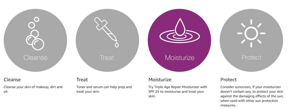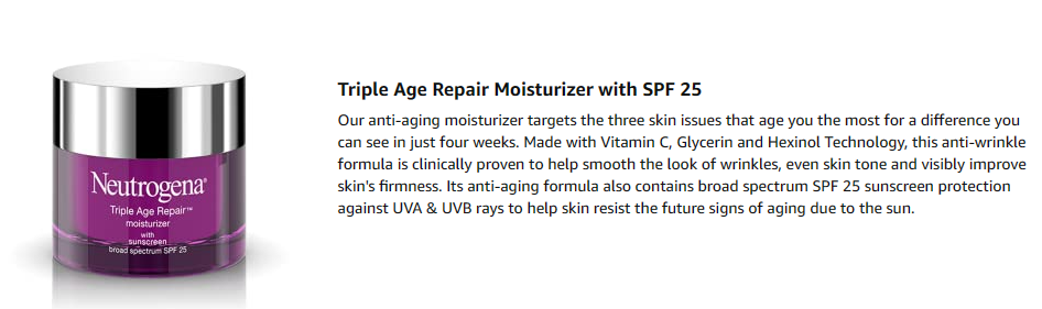 Use Neutrogena Triple Age Repair Daily Facial Moisturizer with SPF 25 Sunscreen to tackle wrinkles, uneven tone and loss of skin resilience. Our anti-aging moisturizer targets the three skin issues that age you the most for a difference you can see in just four weeks. Made with vitamin C, shea butter and glycerin, this daily face cream features Hexinol technology and is clinically proven to help smooth the look of wrinkles, even skin tone, reduce the appearance of dark spots, and visibly firm skin. The anti-aging formula of this neck and face cream also contains broad spectrum SPF 25 sunscreen protection against UVA & UVB rays to help prevent the premature signs of skin aging caused by the sun. Apply this anti-wrinkle moisturizer evenly over face and neck every morning after cleansing for best results. Suitable for everyday use in a regular skincare routine, this face lotion turns at-home hydration of dry skin into a self-care experience.