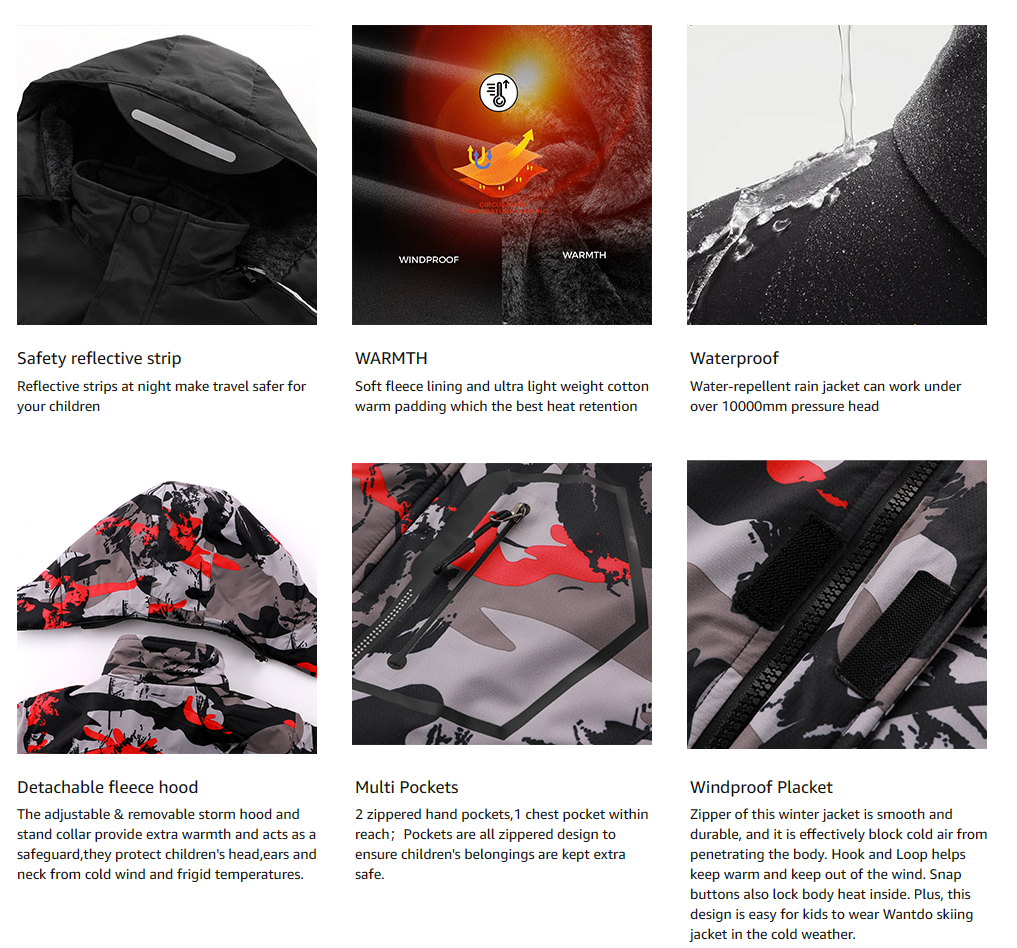 Windproof: ① Adjustable cuffs, stretchable glove with thumb hole help seal in warmth.② Inside windproof snap powder skirt, internal drawcord hem, detachable and adjustable storm hood help to keep wind out. ③ Wear resisting soft shell is highly wind resistant.