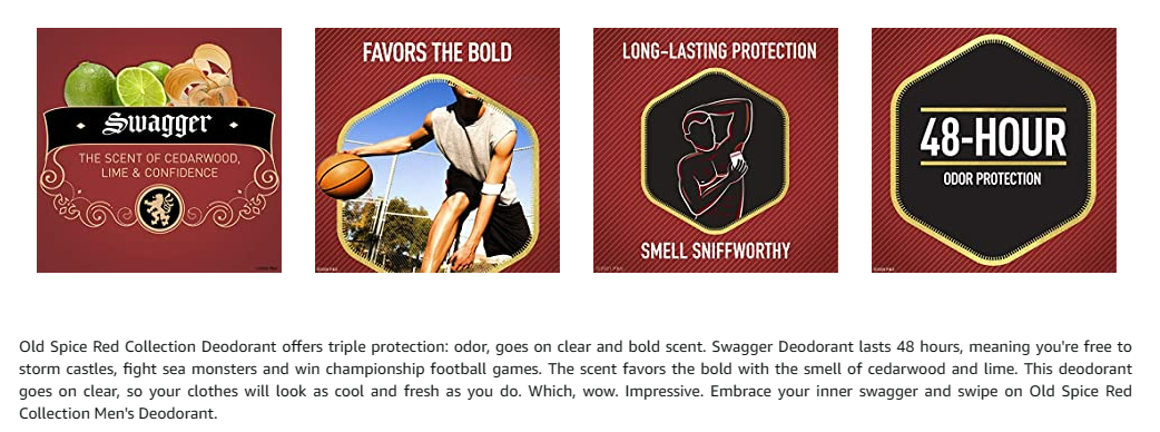 Old Spice Red Collection Deodorant offers triple protection: odor, goes on clear and bold scent. Swagger Deodorant lasts 48 hours, meaning you're free to storm castles, fight sea monsters and win championship football games. The scent favors the bold with the smell of cedarwood and lime. This deodorant goes on clear, so your clothes will look as cool and fresh as you do. Which, wow. Impressive. Embrace your inner swagger and swipe on Old Spice Red Collection Men's Deodorant.