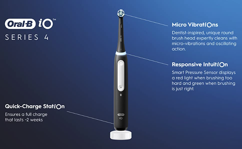 The iO is Oral-B’s best technology: Clinically Proven 500% More Plaque Removal Along Gumline versus a manual toothbrush. The i04 coaches you to a perfect clean. This is real time personalized coaching. The accompanying App shows your daily brushing report. Having 4 Brush Modes (Daily Clean, Whiten, Sensitive, and Super Sensitive) Oral-B is on your team for your everyday brushing task. A Round head and gentle micro-vibrations, the Magnetic interaction delivers smooth, harmonious motion through a Synchronized cleaning action (micro-vibrations synced with oscillations). A Built-in-2-Minute Timer ensures an even easier experience, helping you get an optimal clean on all your teeth. The Oral-B's quadrant timer breaks the two minutes up into four 30-second intervals to clean each quadrant of your mouth; we keep the time, so you don’t have to. Delivering the perfect pressure is done by having a Pressure Sensor. The Pressure Sensor Indicates optimal cleaning pressure and warns of over pressure. With an accompanying travel case, you’ll have a fresh clean everywhere you go. We’re with you on your next trip or even your mid-day on-the go brushing! Best of all, it is brought to you by Oral-B—the #1 brand used by dentists worldwide.* *Based on surveys of a representative worldwide sample of dentists carried out for P&G regularly.Do not use on children under age 3. Replace brush (head) every 3 months or sooner if brush head becomes worn.