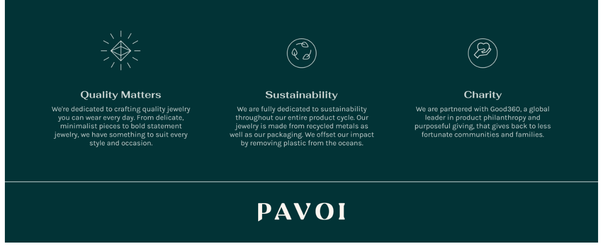 ✦ SUSTAINABILITY ✦ PAVOI is dedicated to sustainability throughout our entire product cycle. Our jewelry is made from 100% recycled materials and we package in 99% recycled and compostable materials. We work to reduce our carbon emissions and offset plastic consumption by removing 275,000 bottles from oceans annually. We are committed to maintain a balanced and eco-friendly business that minimizes our environmental impact. Trust that PAVOI is continuously working towards a greener future.