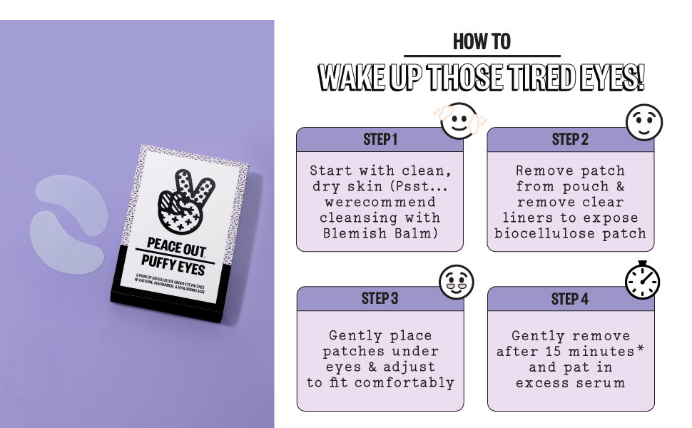 Peace Out Puffy Eyes. 6 pairs of soothing biocellulose under-eye patches that help awaken sleepy-looking eyes for a more fresh, revitalized glow and feel.