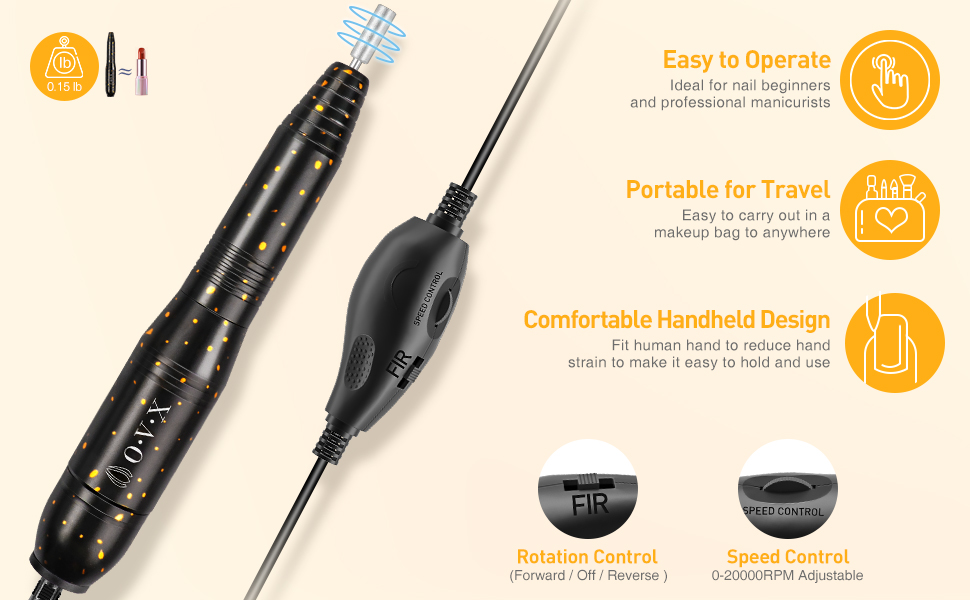 Adjustable Speed&Direction: Varying speed from 0-20,000 RPM with speed controller. Can start out slow while getting used to it. Forward and Reverse rotation direction makes you feel easy to use both left and right hand do nail drill.
