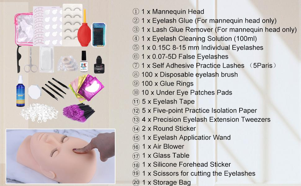 ? THE BEST CHOICE IS ALL IN ONE - Mannequin Head, Disposable Mascara Wands, Glue Rings, Eyelash Glue (For mannequin head only), Tweezers, False Eyelashes, Air Blower, Eye Patches Pads, Silicone Forehead Sticker, Eyelash Applicatior Wand AND SO ON. The ultimate value packed kit!