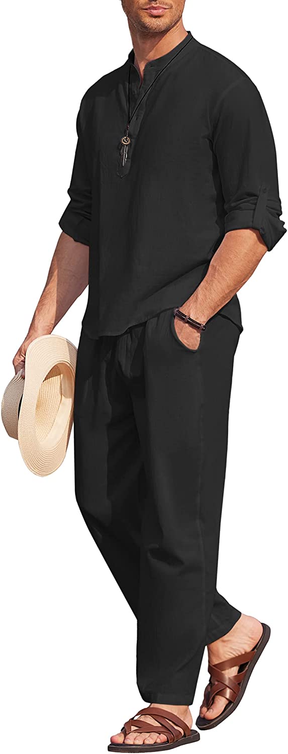 COOFANDY Men's 2 Pieces Cotton Linen Set Long Sleeve Henley Shirts Casual Beach Pants With Pockets Summer Yoga Outfits