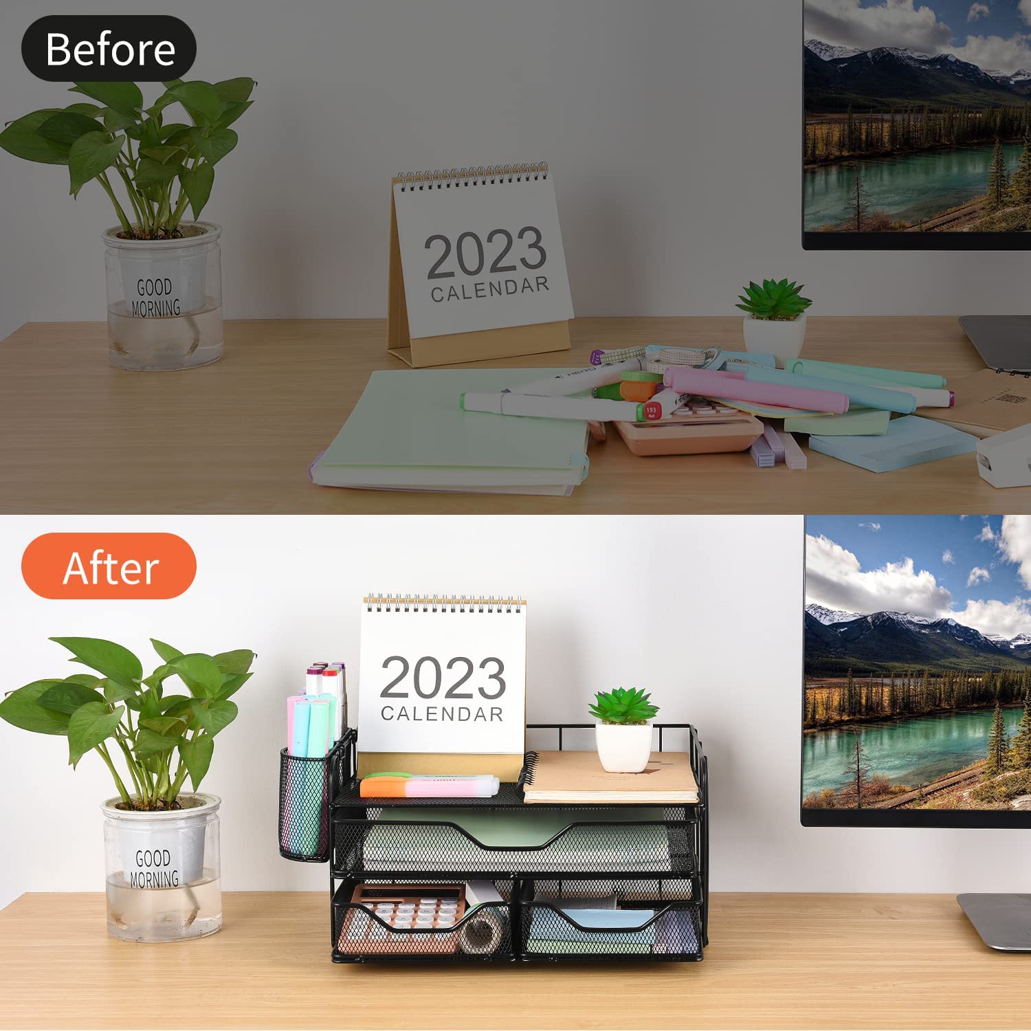 VIVSOL Desk Organizer with Mesh File Holder, 4-Tier Office Supplies Desk Organizers and Accessories with Sliding Drawers, 3 Trays & Pen Holder, Desk File Organizer and Storage for Office, School, Home