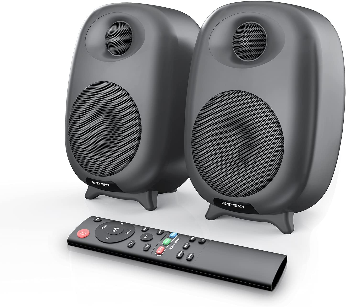 BESTISAN 50 Watt Powered Bookshelf Speakers with Bluetooth 5.0 and Wired Optical RCA Input Port, Bass and Treble Adjustable, Deep Bass, 3 Audio Mode Design, Remote Control